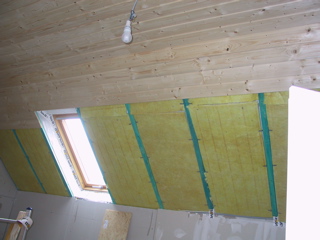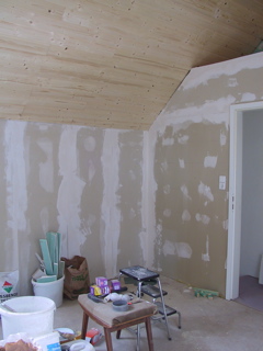 Die Holzdecke im Gästezimmer ist soweit fertig und die Wände sind verspachtelt. Das Zimmer könnte bis Ostern fertig werden.