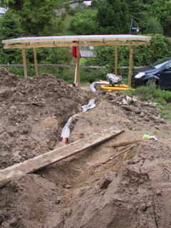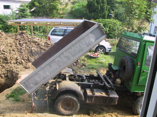 Vor der Lieferung des Tanks noch etwas Kies (ca. 3 to) ins Loch.