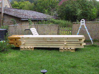 Das Holz für den Dachstuhl ist schon da und wird jetzt von uns vorbereitet um dem Holzwurm den Appetit zu verderben.